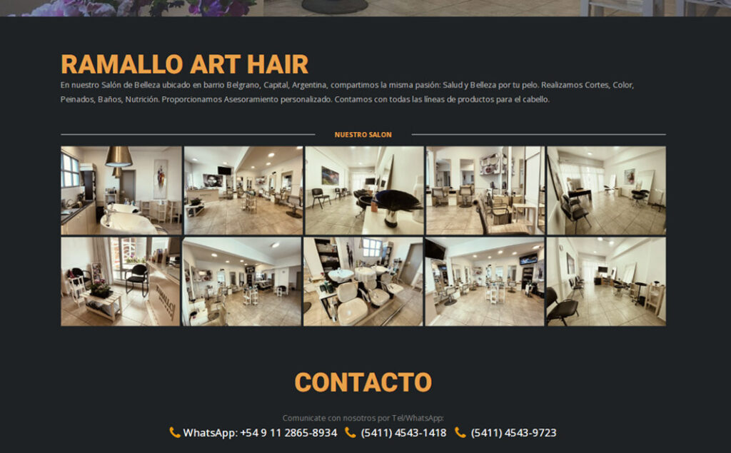 Diseño de sitio institucional del salón de belleza Ramallo Art Hair, la web cuenta con una amplia galería de cortes dividida por sección.